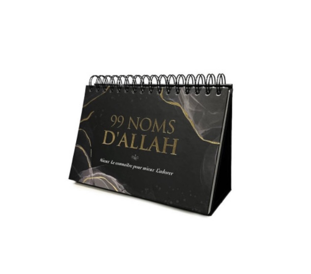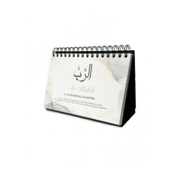 Calendrier chevalet Ć spirales avec les 99 noms dāAllah, avec traduction et signification. Format du papier (21 x 14 cm) / Format extĆ©rieur (21 x 21 cm) Orientation paysage, Chevalet stable et pratique, Couverture cartonnĆ© avec dorure, 100 pages. Le cadeau musulman idĆ©al Ć offrir