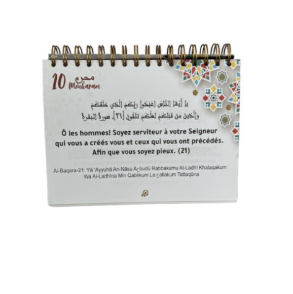Une invocation chaque jour est un magnifique calendrier bilingue – perpétuel, joliment illustré à motif floral, dont les cadres raffinés défilent au fil des mois – qui, comme son nom l’indique, comprend 365 invocations tirées du Coran (dont les 40 Rabbanâ), de la Sunna prophétique authentique, et énumère les 99 beaux noms d’Allah par lesquels il sied à tout un chacun de prier le Très-Haut dans l’espoir d’être exaucé, de même que l’invocation de clôture de récitation du Coran que certains préconisent.